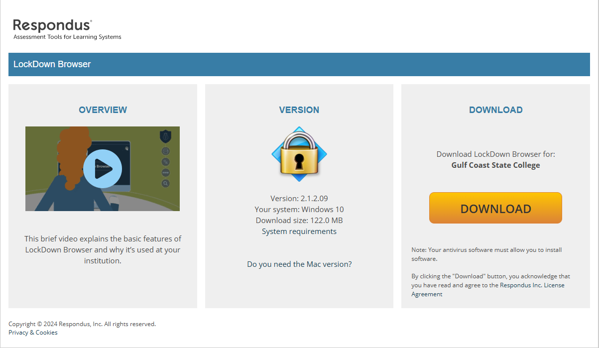 If you do not have the Respondus Lockdown Browser installed, please click the link provided on the message. This will take you to the download page for the Respondus Lockdown Browser. You can also click this link in this document, which will take you directly to the download page.
